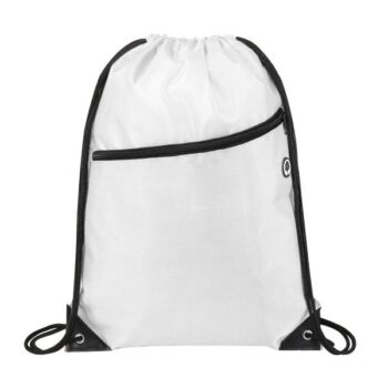 Item # PR 3408 – Made from durable 210D polyester, this drawstring backpack combines strength and style. The adjustable black drawstring closure ensures a secure and comfortable fit, while the spacious front zippered pocket with an integrated earbud slot keeps essentials organized and easily accessible. Designed with reinforced black PU leather corners and sturdy metal grommets, it delivers long-lasting durability for everyday use. Perfect for graduations, trade shows, and promotional events, this backpack is a practical giveaway that highlights your brand and leaves a lasting impression.