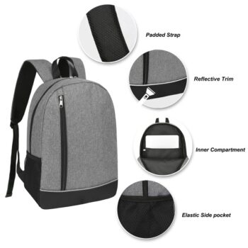 Item # PR 3493 – This durable polyester backpack features a spacious main compartment, vertical front pocket, side mesh pockets, and an inner slip pocket for easy organization. The two-tone design with reflective trim adds style and safety, while padded straps ensure comfort for school, work, travel, or outdoor use. Add your logo for a standout promotional item.