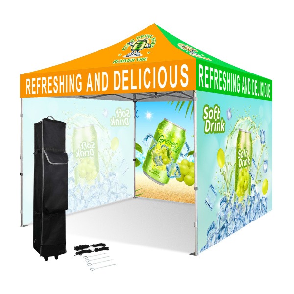 Item # PR 3250- This commercial-grade 10′ x 20′ pop-up tent is built with a durable 40mm hexagonal aluminum frame and 1.5mm gauge ABS nylon joints for superior strength and stability. The canopy and three single-sided full walls are made from heavy-duty 600D polyester that is water-resistant, UV-protected, and fire-retardant, with vibrant full-color, full-bleed dye sublimation printing to showcase your brand. Legs feature automatic push buttons for four pinch-free height adjustments, while the included stake kit and wheeled carry bag ensure easy setup, transport, and storage. Enough stock is always available. Get a free quote now!