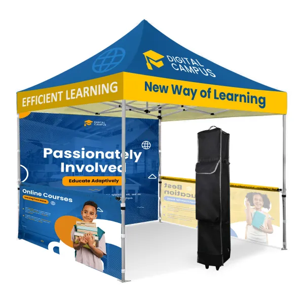 Item # PR 3235 – Promote your brand year-round with this durable event tent, built with a 30mm commercial-grade black powder-coated steel frame, reinforced ABS nylon joints, and a thumb-latch lock system for safe, effortless setup. The heavy-duty 600D polyester canopy is water-resistant, UV-protected, and fire-retardant, offering reliable performance in any season. Showcase your creativity with vibrant full-color dye sublimation on the canopy and valances, and enjoy easy transport and secure installation with the included stake kit and wheeled carry case. Enough stock is always available. Get a free quote now!