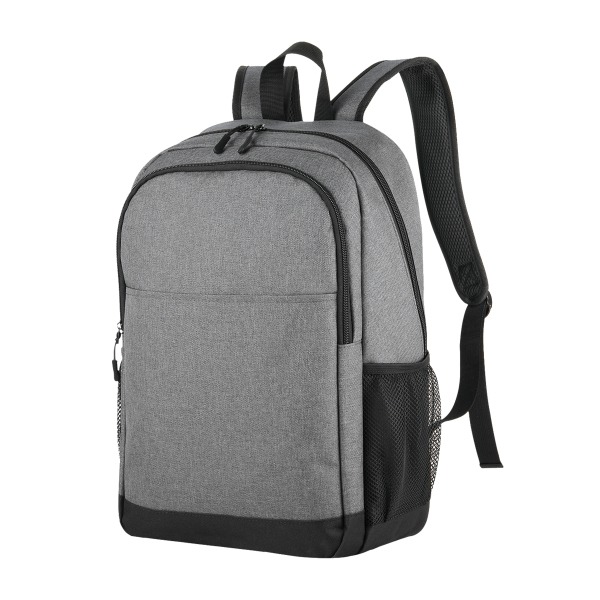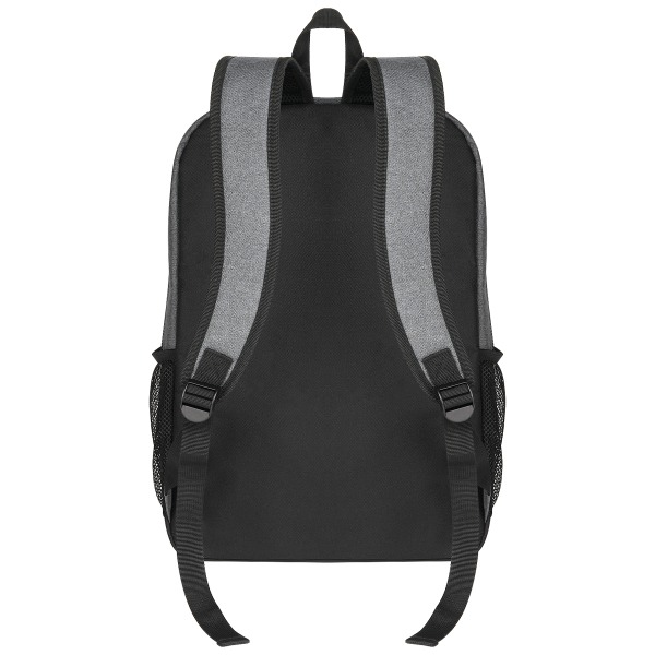 Item # PR 3523 – Crafted from durable 600D heathered polyester, this two-tone computer backpack combines style and function. It features padded straps and back support for all-day comfort, a spacious main compartment with padded sleeve for laptops up to 15.6″, and multiple pockets for easy organization. Side mesh pockets keep bottles or umbrellas handy. With a large imprint area for your logo via heat transfer, silk screen, or embroidery, it’s the perfect promotional gift for work, school, or travel.