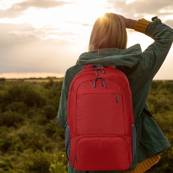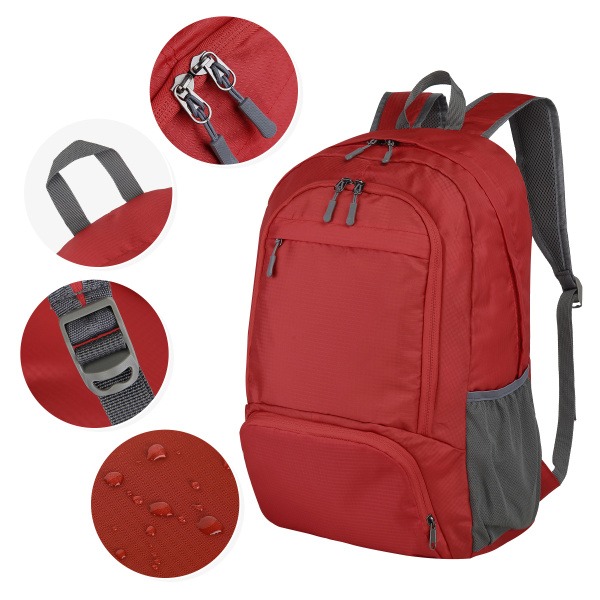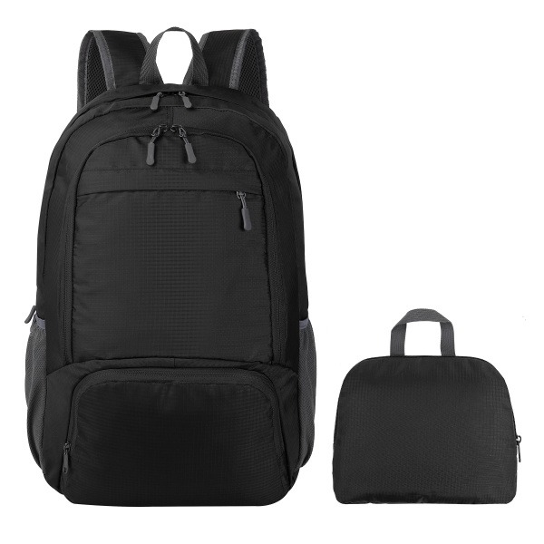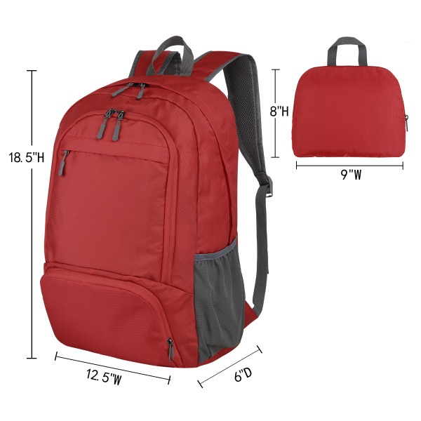 Itwm # PR 3492 – Made from water-resistant ripstop polyester, this 30L foldable backpack packs into a compact 9” x 8” pouch. It features two main compartments, multiple zippered/front/side pockets, and padded adjustable straps for comfort. Perfect for travel, hiking, camping, and everyday adventures.