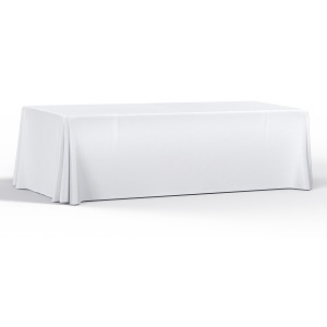 Item # PR 3218 -This 4-side, 8-foot polyester table throw is a powerful way to promote your personalized logo at trade shows, conventions, conferences, exhibitions, meetings, fairs, church events, family gatherings, weddings, sports events, and more. Designed to fit a standard 8-foot table, our Ultra Fit sublimated tablecloth can be customized with a full-coverage printed design or a front-panel print for a sleek, professional finish. Available in four-sided styles with or without a convenient back zipper, as well as open-back and 3-sided options. Made from durable polyester, it’s machine washable for long-lasting use and easy care.
