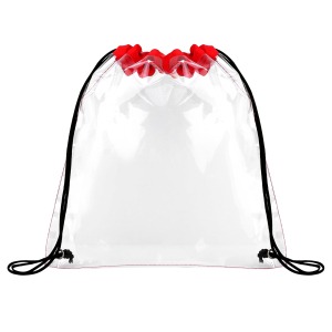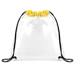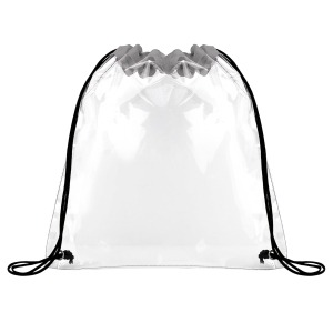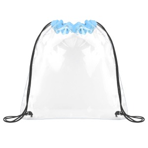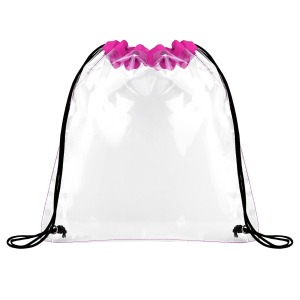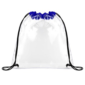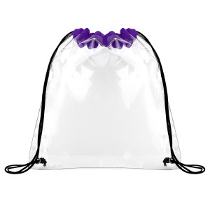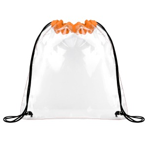 Item # PR 3411 – This clear drawstring backpack is made of clear heavy vinyl material with metal grommets. The drawstring closure compartment can hold clothing, books and bulky items. Dual drawstrings cinch the bag at the top and provide over-the-shoulder or backpack carry. It also complies with NFL stadium security requirements as long as logo size does not exceed 4.5″ tall by 3.4″ wide. It is perfect for sport events, parades, festivals, schools, camps, clubs, concerts!