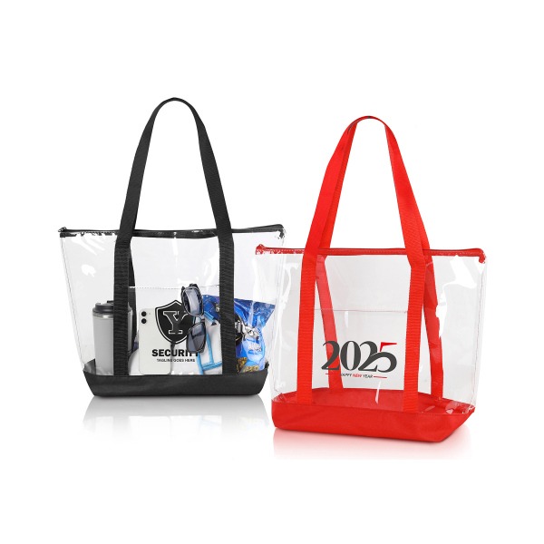 Item# PR 3106 – Clear Zippered Tote Bag with Pocket, the perfect companion for stadiums, concerts, schools, and workplaces that require transparent bags. Made from durable, high-quality 0.25mm PVC + 600D Polyester, this tote ensures easy visibility of contents while maintaining a sleek, professional look. The secure zippered main compartment keeps your belongings safe, while the front pocket offers quick access to smaller essentials like phones, tickets, or keys. Sturdy handles make it comfortable to carry, even when fully loaded. Customize it with a logo, quote, or any custom design for promotion or branding. Get a free quote now!