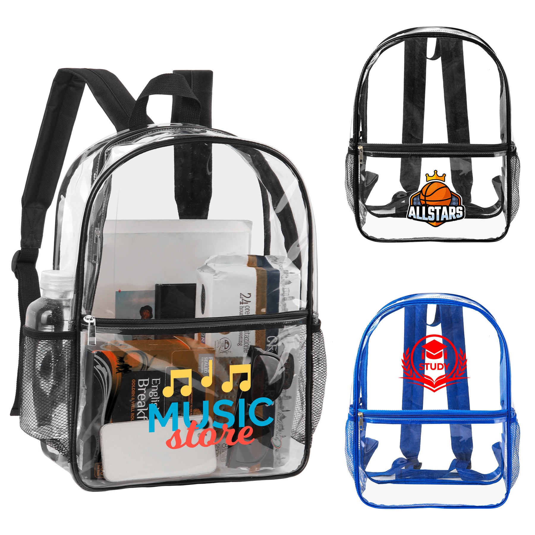 Item # PR3481 – This clear backpack is made of 0.3mm PVC with a roomy main compartment, side mesh pockets for bottles or umbrellas, and a spacious front pocket for smaller essentials. Designed to meet clear bag policies, it’s perfect for school, stadiums, concerts, airports, and high-security workplaces.